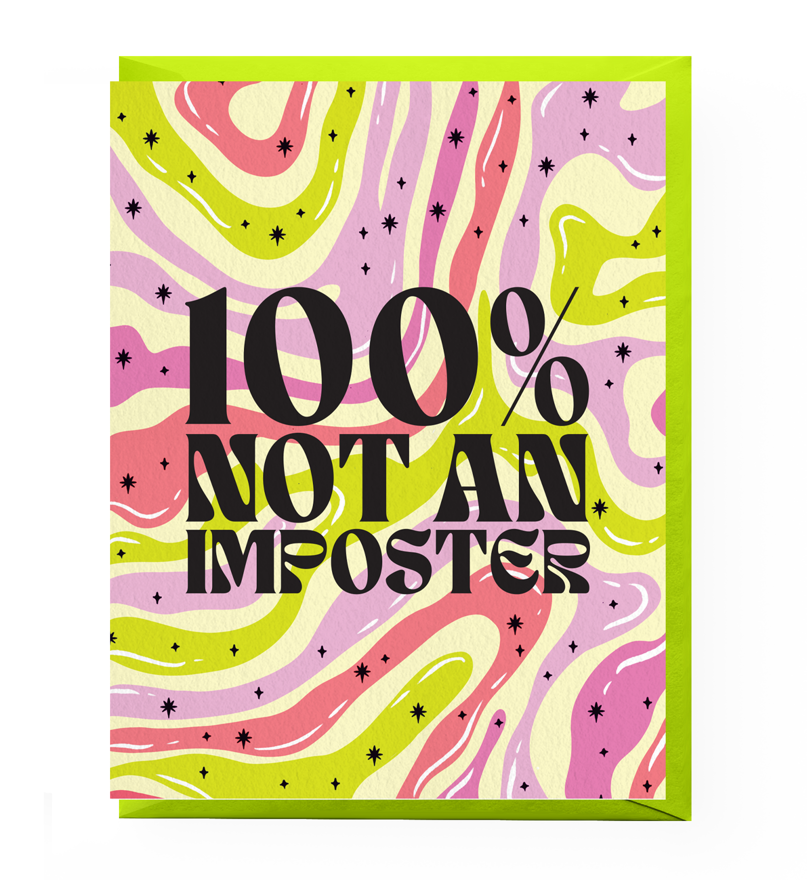 Card reads "100% Not An Imposter" and features a '70s psychedelic swirl pattern in green, purple and peach.