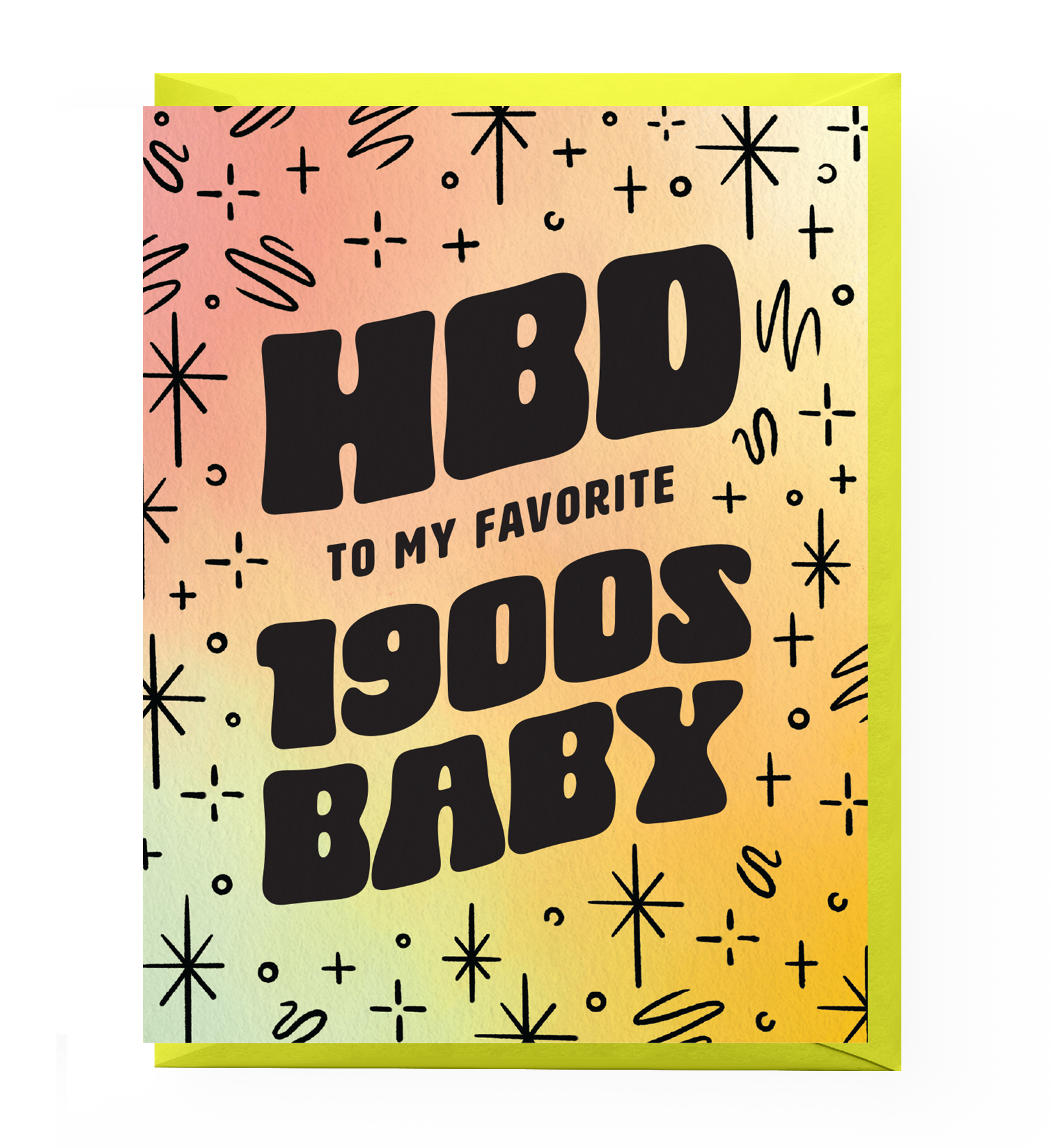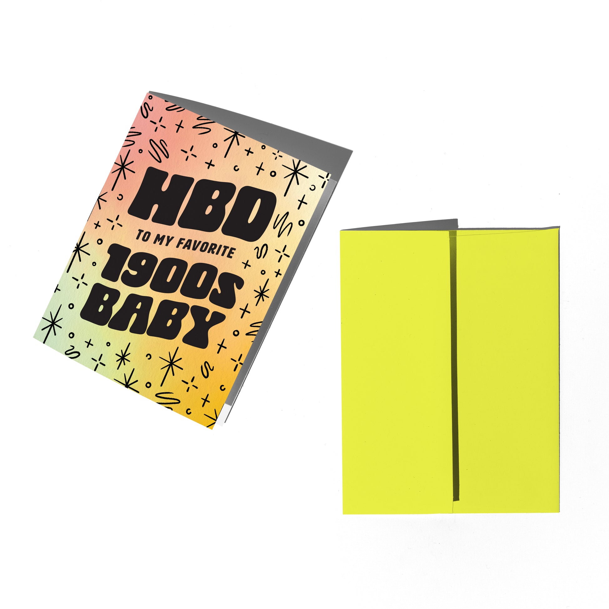 Card reads "HBD to my favorite 1900s baby" against a dreamy gradient backdrop.