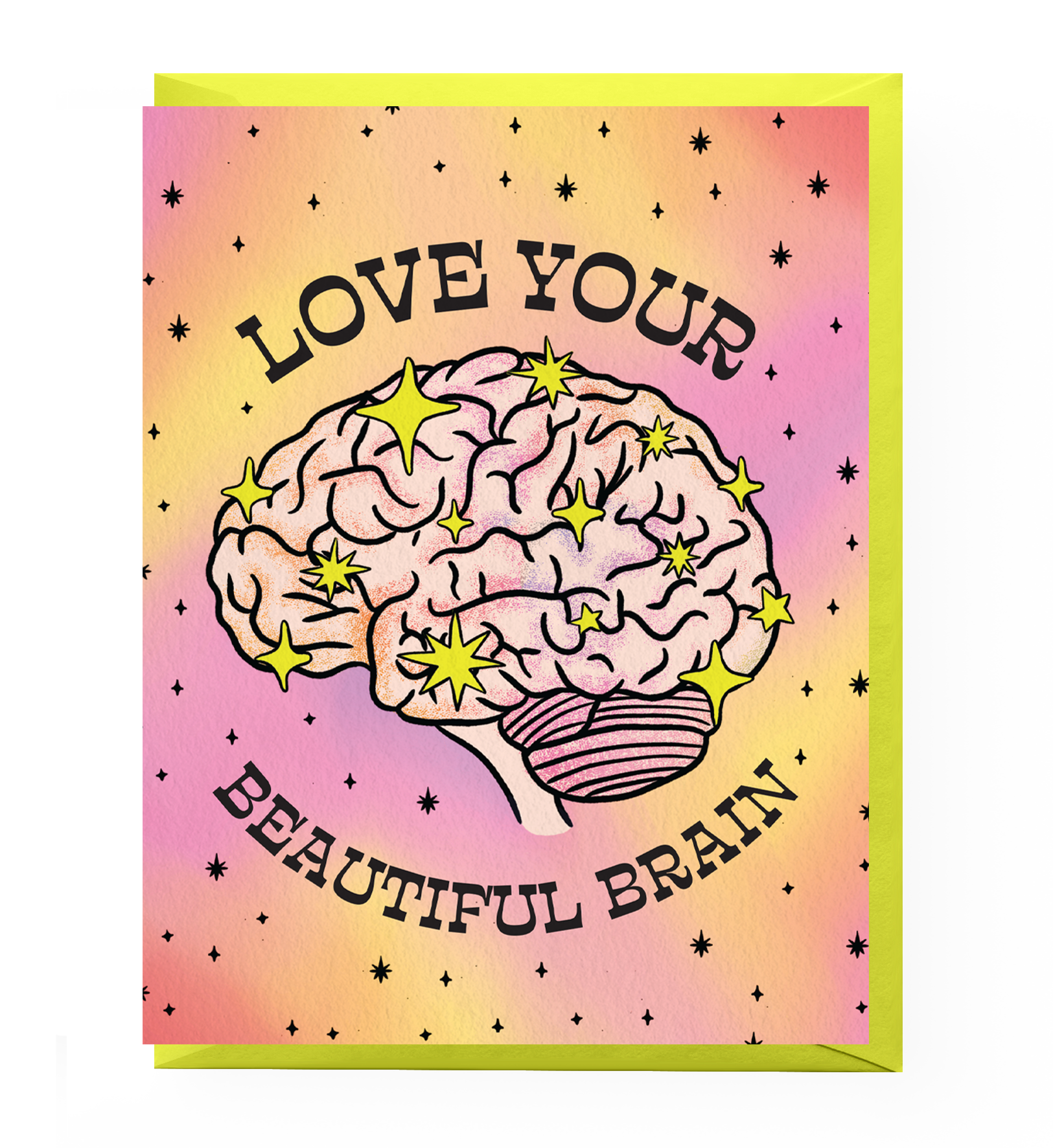 Card reads "Love Your Beautiful Brain" and features an illustrated brain with sparkles against a dreamy yellow, pink and orange backdrop. Perfect for celebrating neurodiversity!
