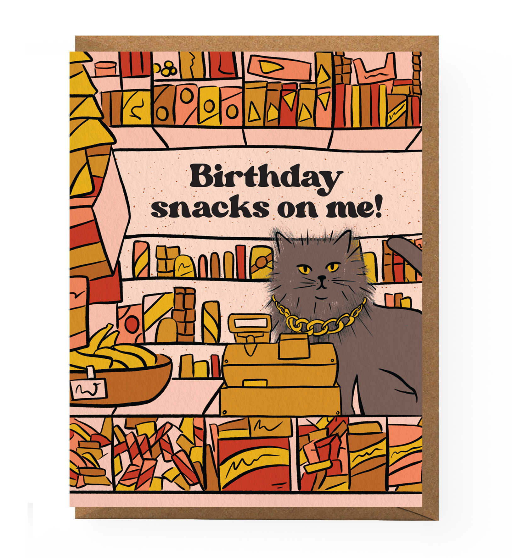Card features an illustrated scene of a bodega cat surrounded by snacks and reads "Birthday snacks on me!"