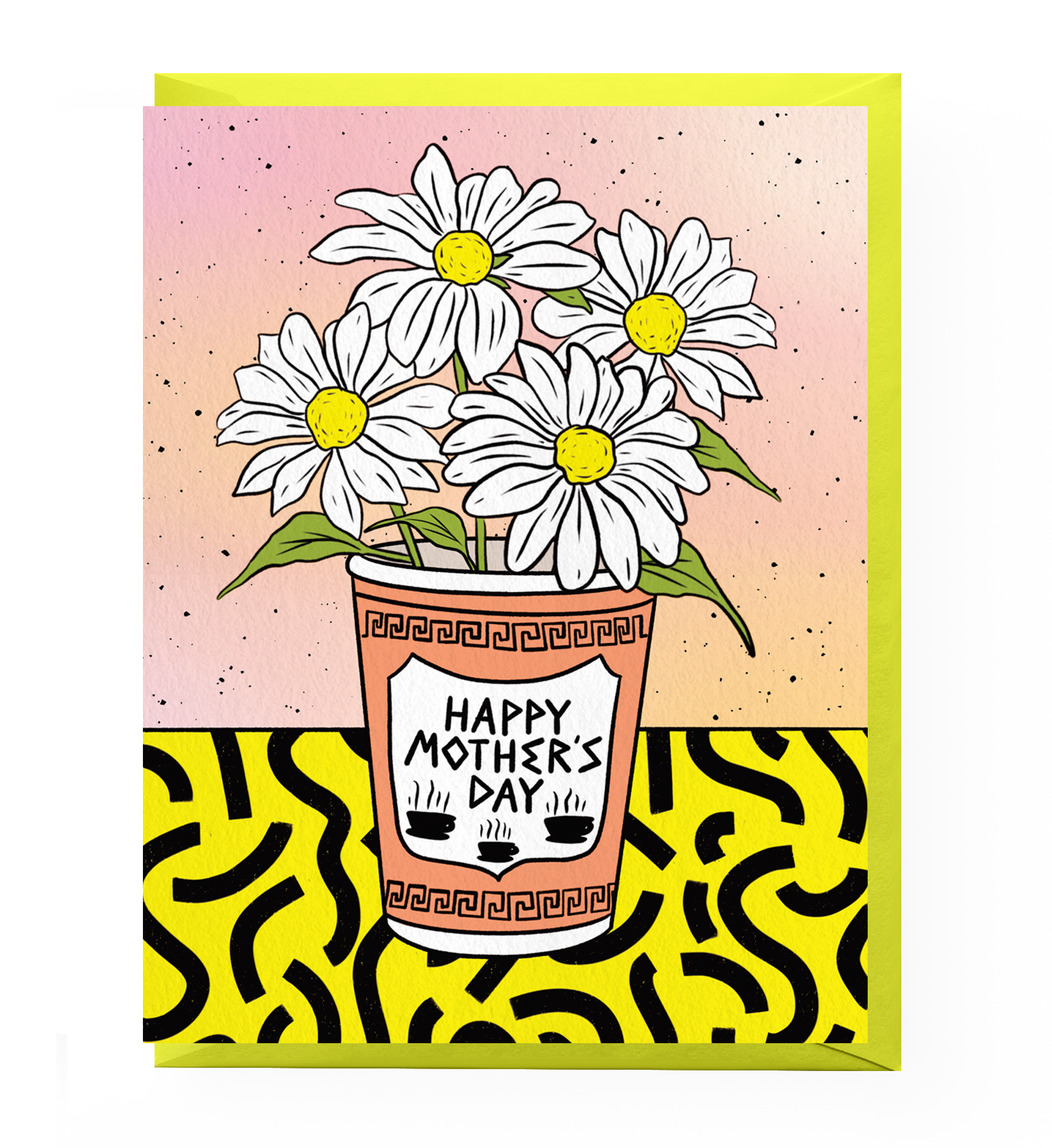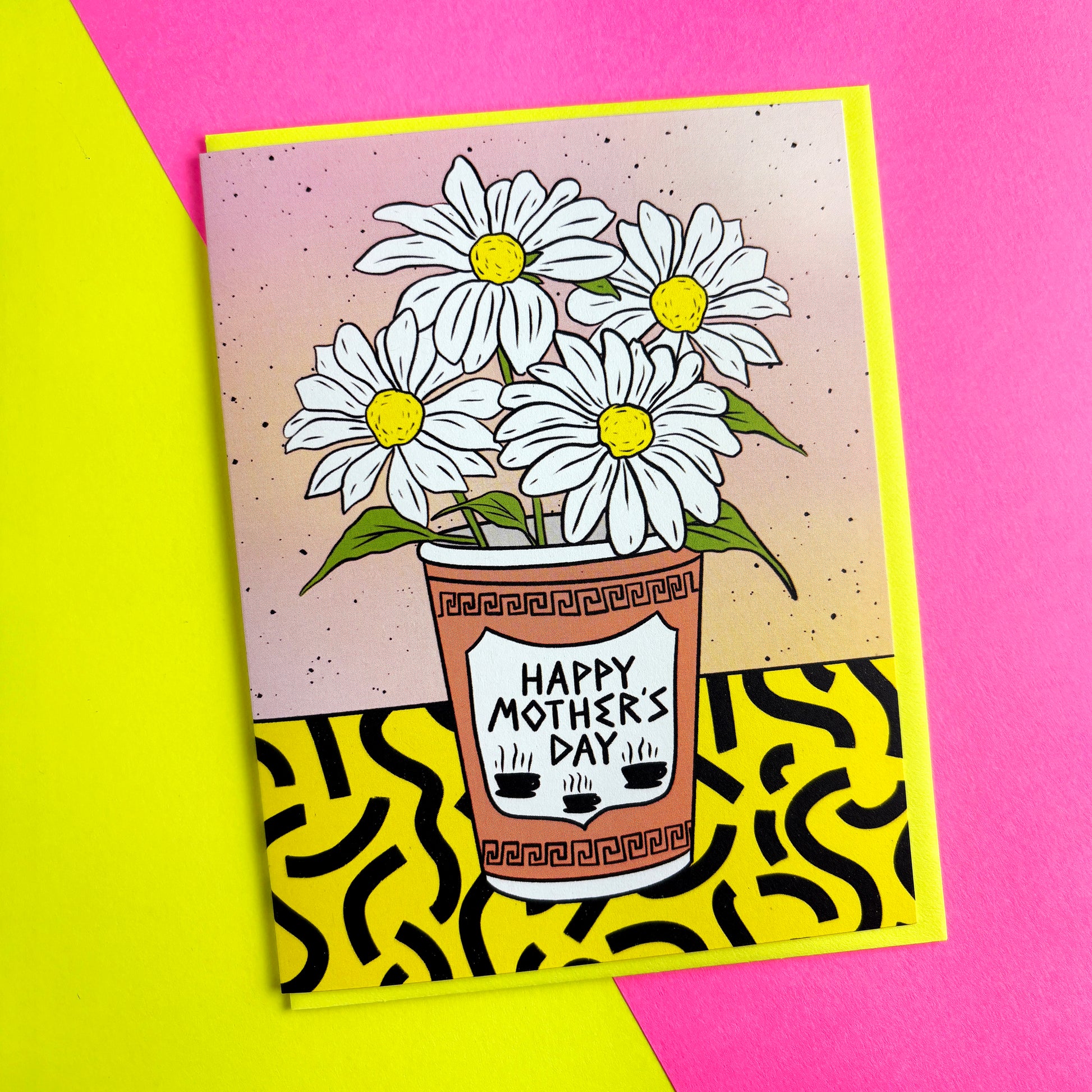 Mothers Day card features an illustrated bodega coffee cup filled with white and yellow daisies.