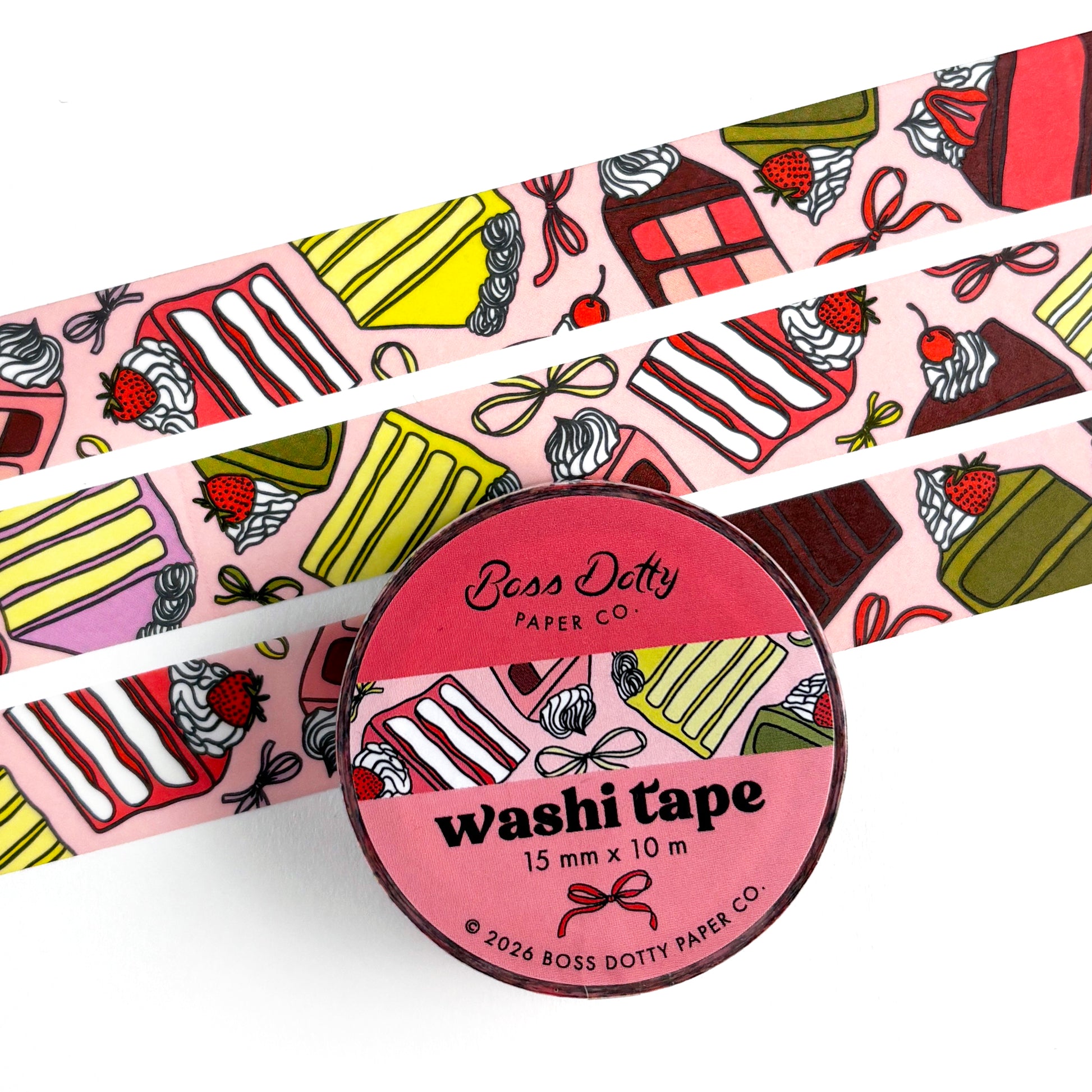 • Features a repeating pattern of bows and layered cake slices—chocolate cherry, lemon lavender, matcha strawberry, classic yellow, and more.