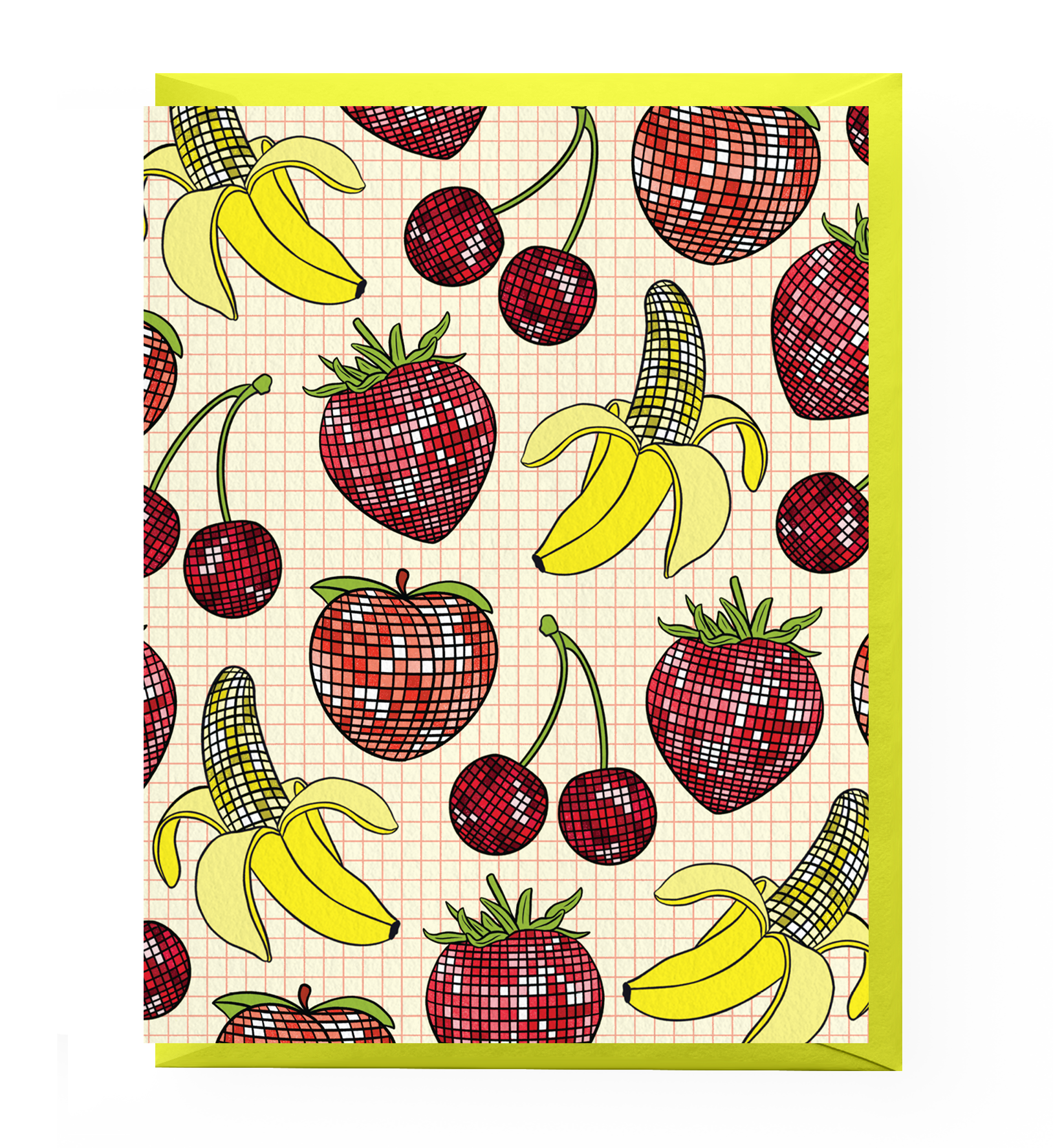Card is blank inside and features a pattern of disco cherries, disco peaches, disco bananas and disco strawberries.