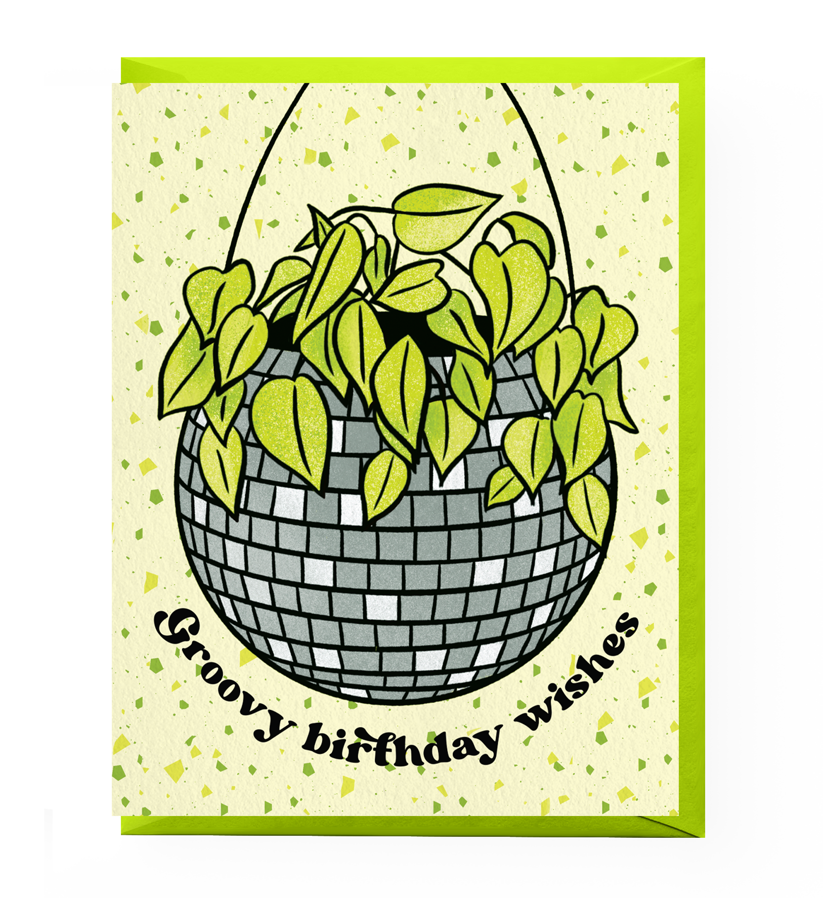 Card reads "Groovy Birthday Wishes" and features an illustrated house plant in a hanging disco ball planter.