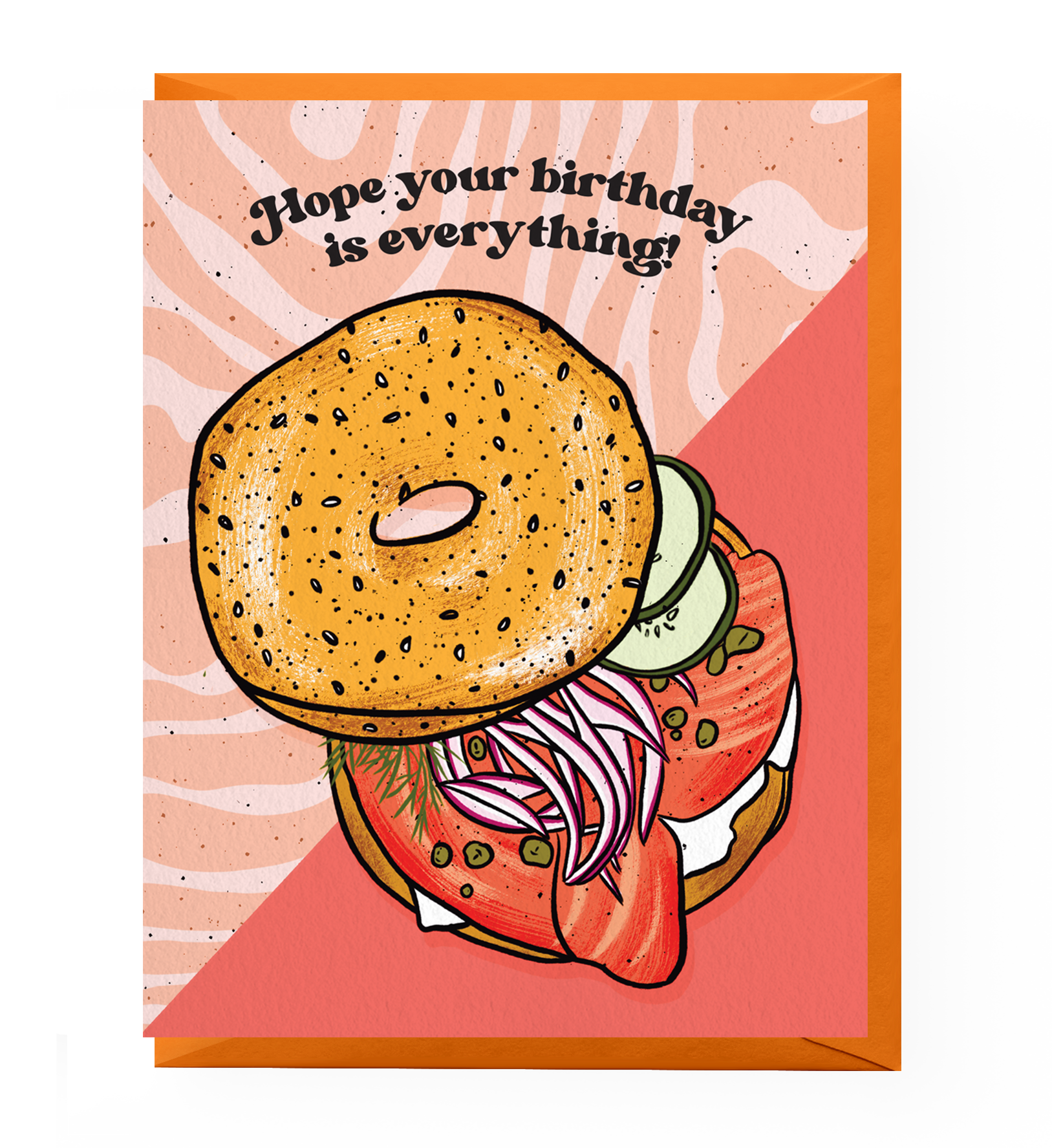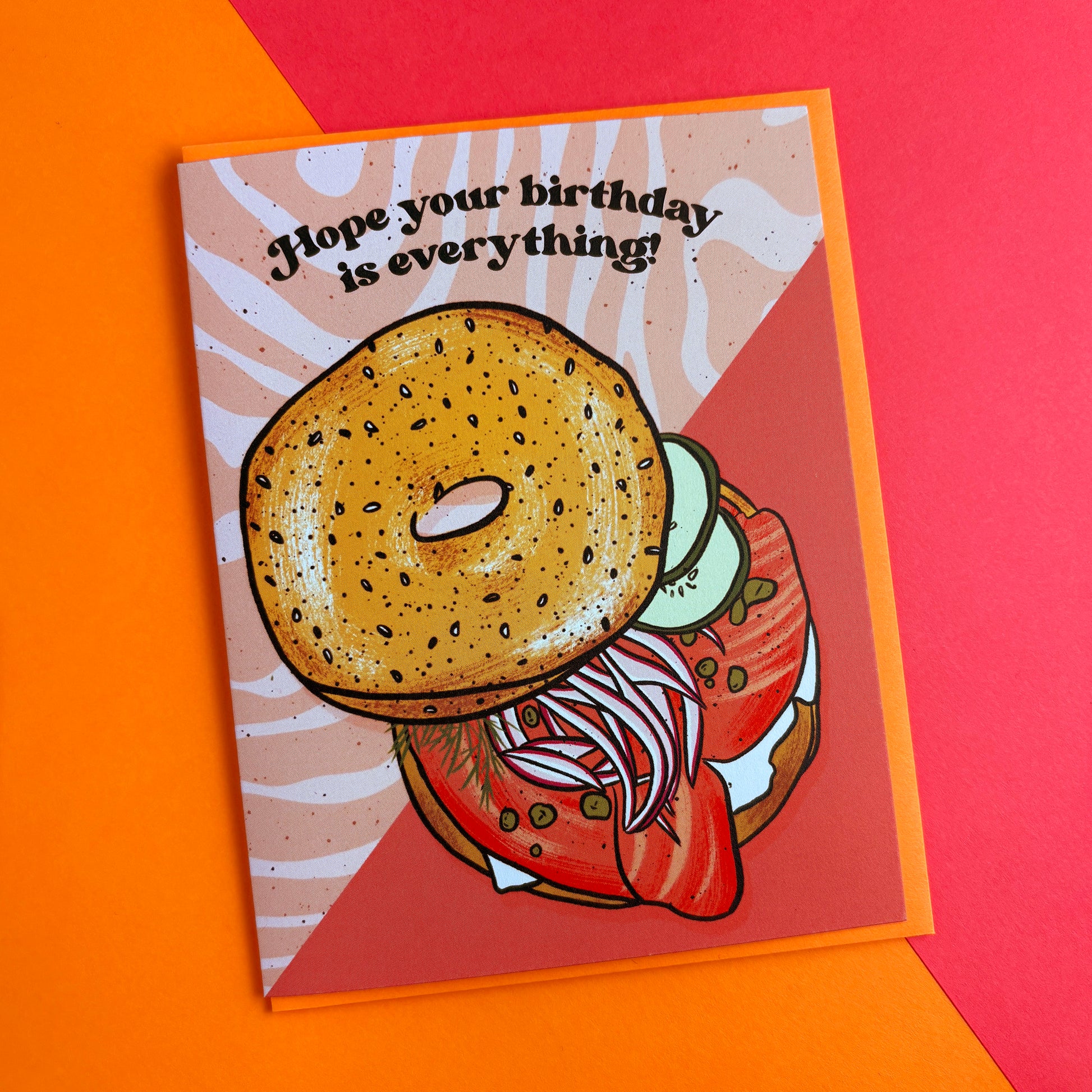 Card reads "Hope Your Birthday Is Everything" with an illustrated New York-style everything bagel topped with cream cheese, lox, onions capers and cucumbers.