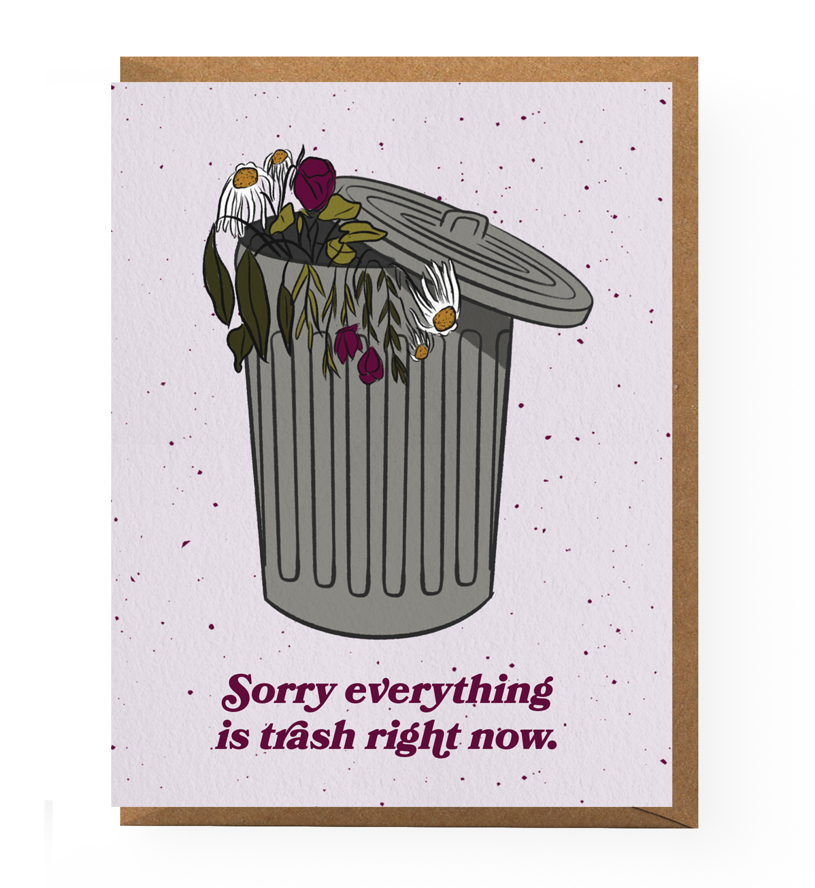 Card reads "Sorry everything is trash right now" and features an illustrated metal trash can filled with dying flowers in purple, olive and grey.