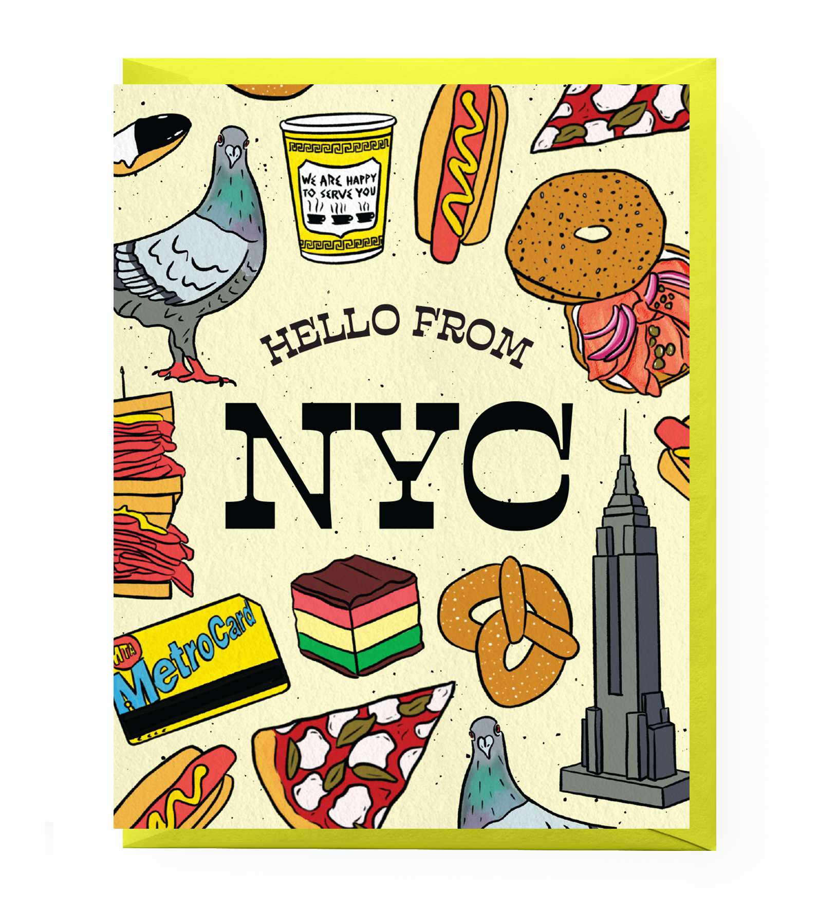 Card reads "Hello From NYC" and features illustrations of a pigeon, pizza, Empire State Building, bagel, coffee cup, and more.