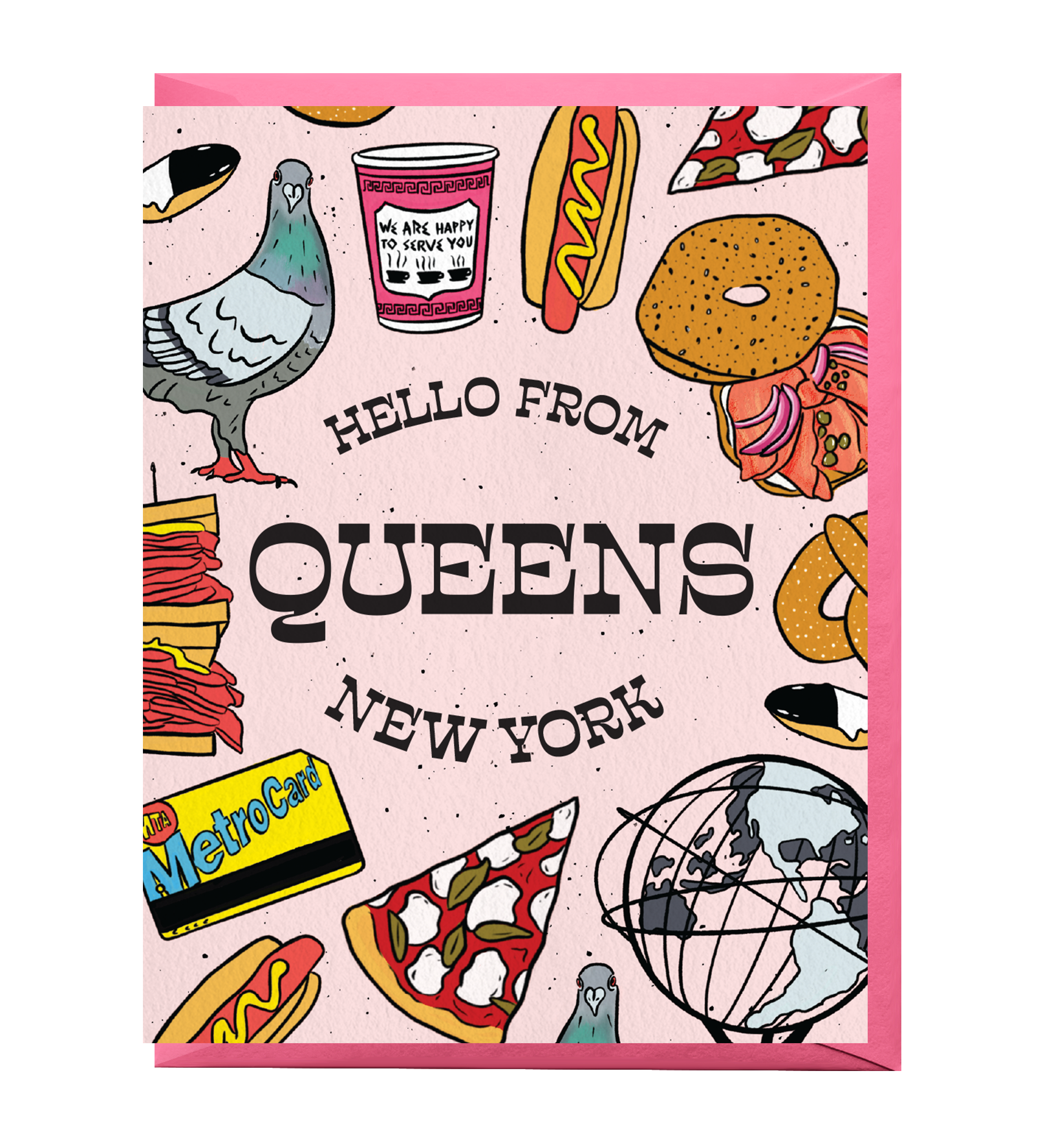 Card reads "Hello From Queens" and features illustrations of a pigeon, pizza, bagel, coffee cup, and more.