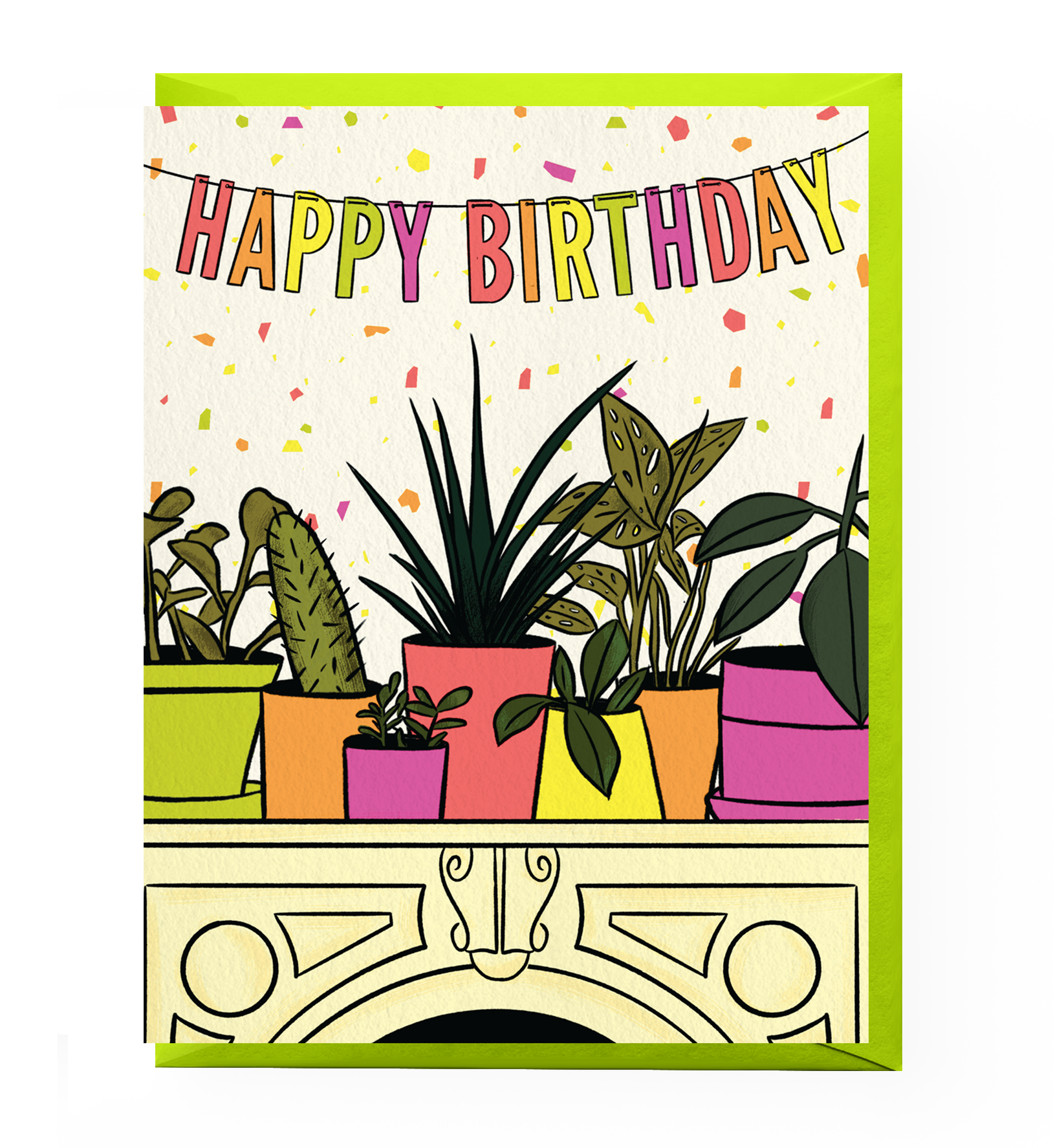Card features a mantle filled with house plants in colorful pots paired with a Happy Birthday banner.
