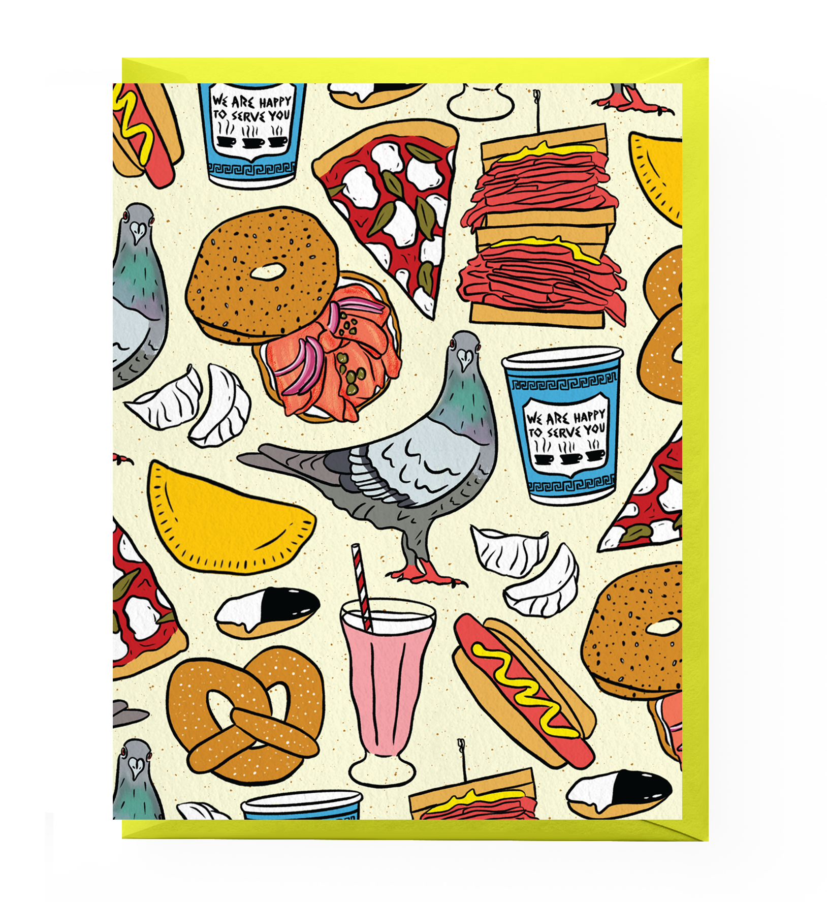 Blank patterned card features pigeons, everything bagels, coffee cups, pretzels, pizza, hot dogs, and more.