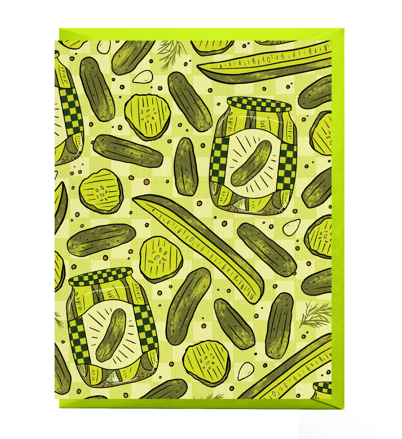 Card is blank and features a repeating pattern of pickle jars, pickle slices and spears in a green checkerboard motif.