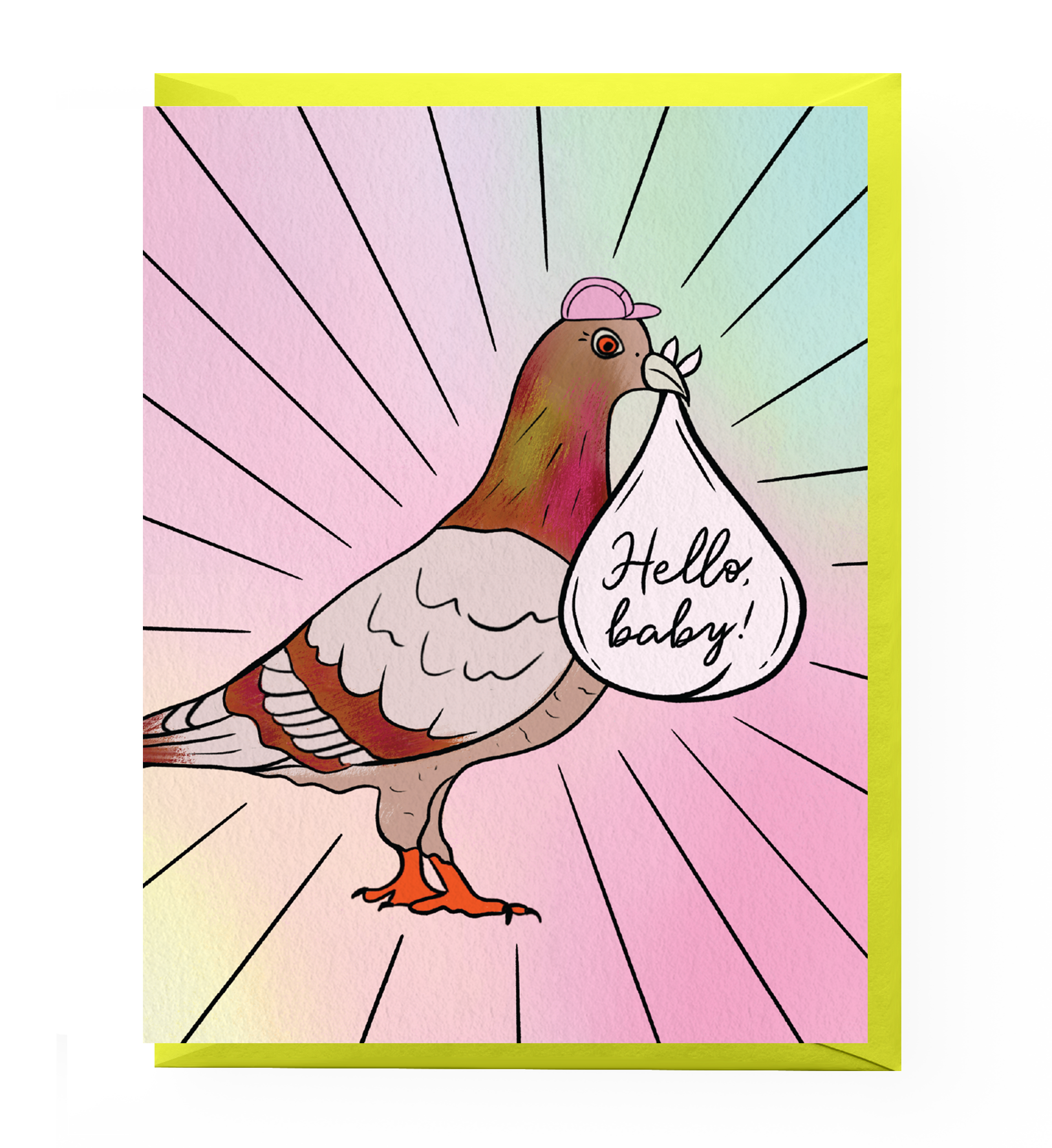 Card reads "Hello, Baby!" and features a pigeon playing the role of stork, carrying a baby bundle against a dreamy pastel backdrop.