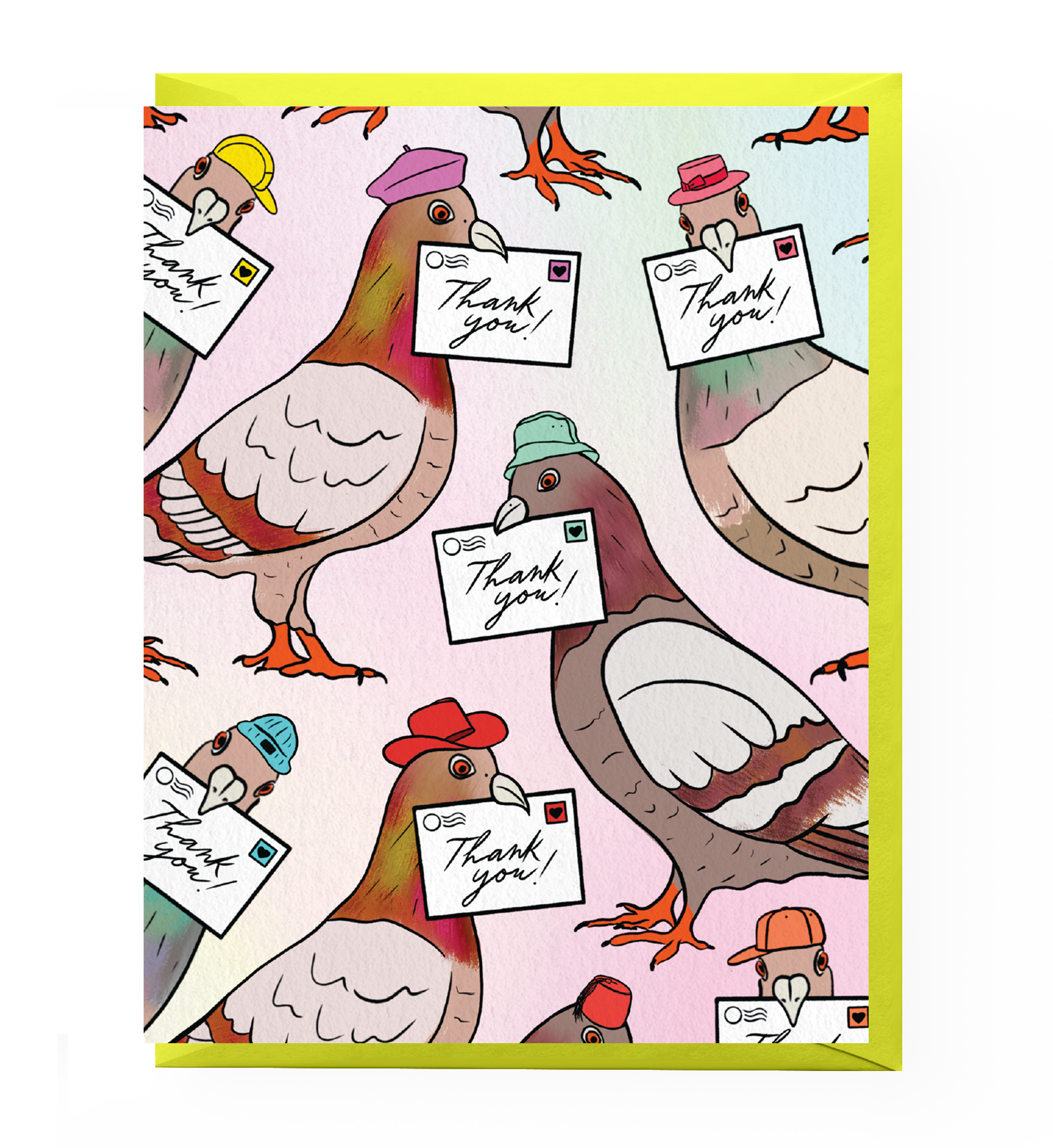 This blank greeting card features an oversized pattern of illustrated pigeons wearing a variety of hats and carrying thank you letters.
