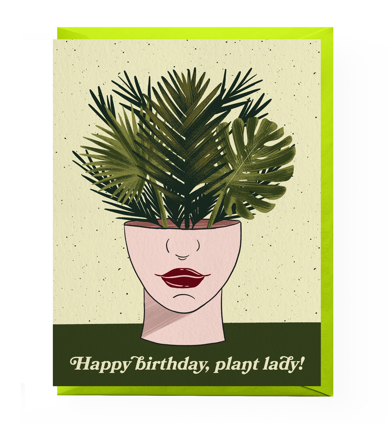 Card reads "Happy birthday, plant lady!" and features and illustrated head vase filled with tropical plant leaves.
