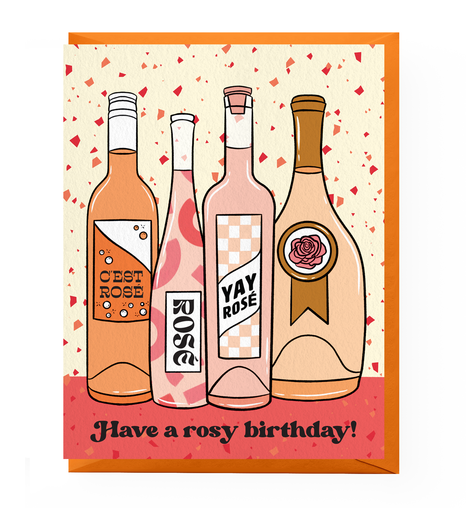 Card reads "Have a rosy birthday" with illustrated rosé wine bottles in pink, peach and orange.