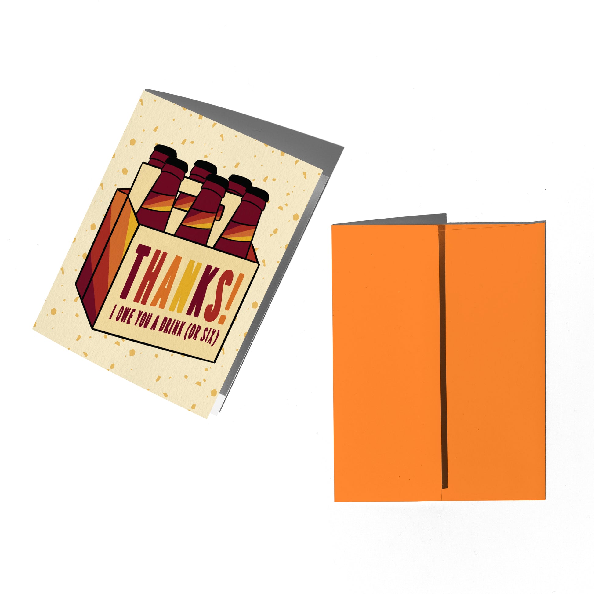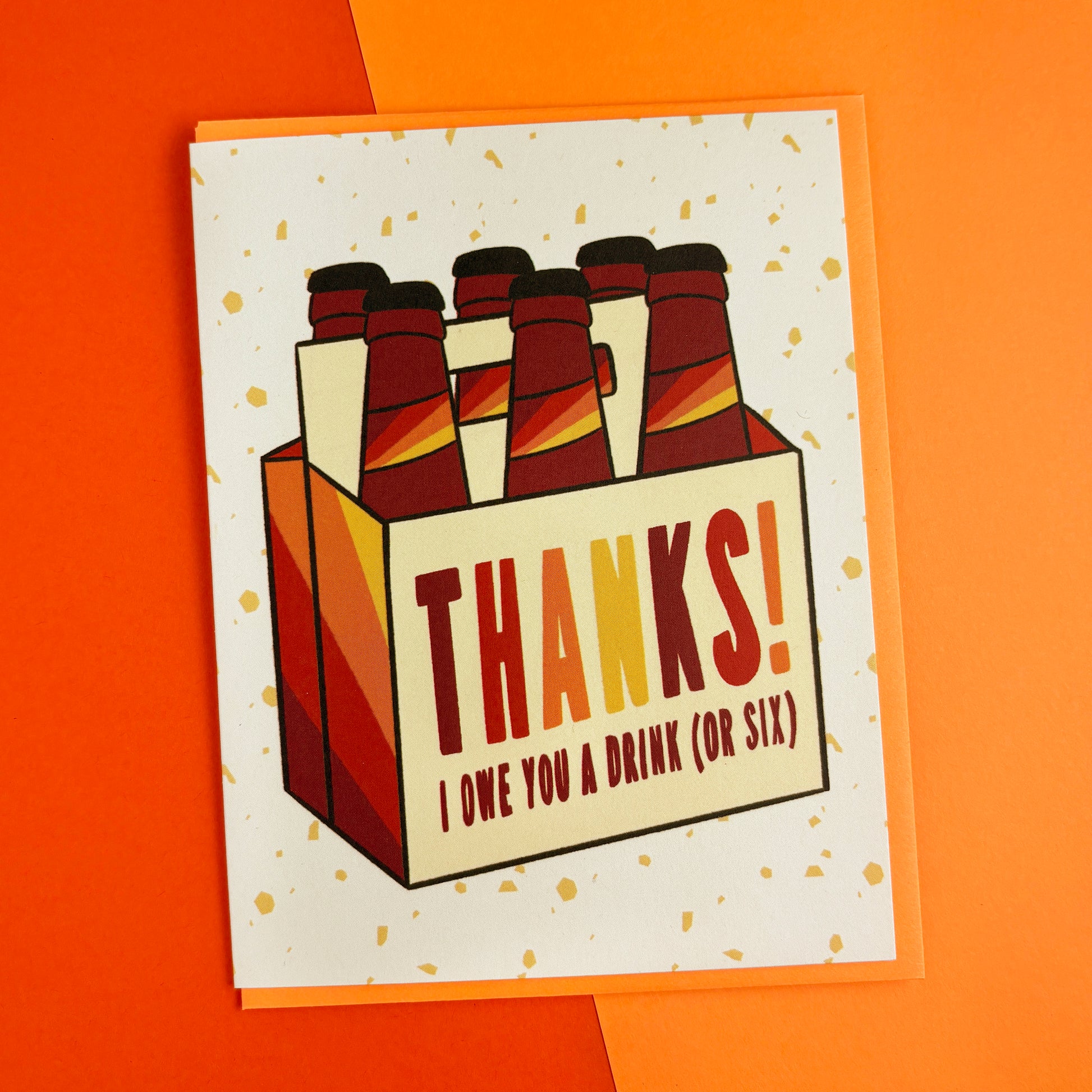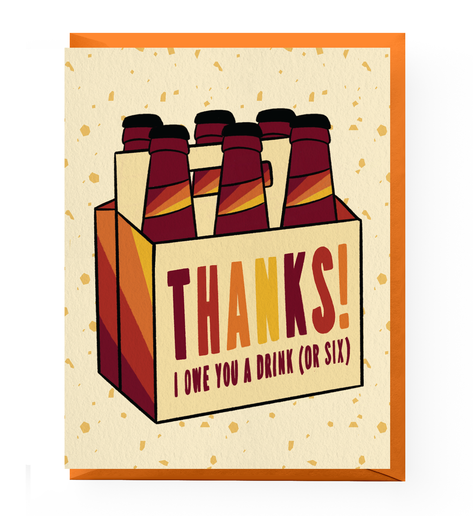 This thank you card reads "Thanks! I owe you a drink (or six)" and features an illustrated six pack of beer in maroon, rust, orange and yellow.
