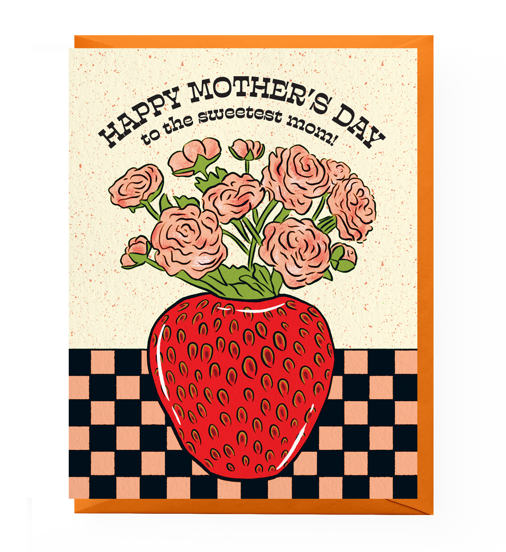 Mothers Day card reads "Happy Mother's Day to the sweetest mom" and features and illustrated strawberry vase filled with peach flowers and a checkerboard background.