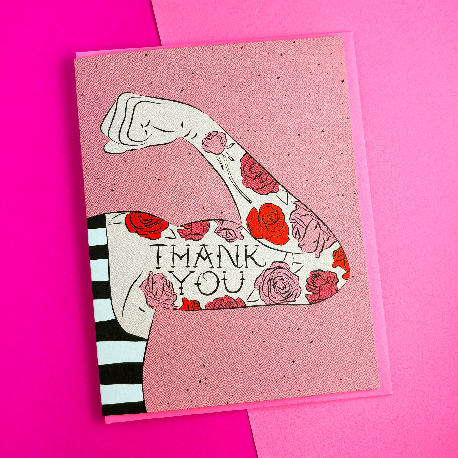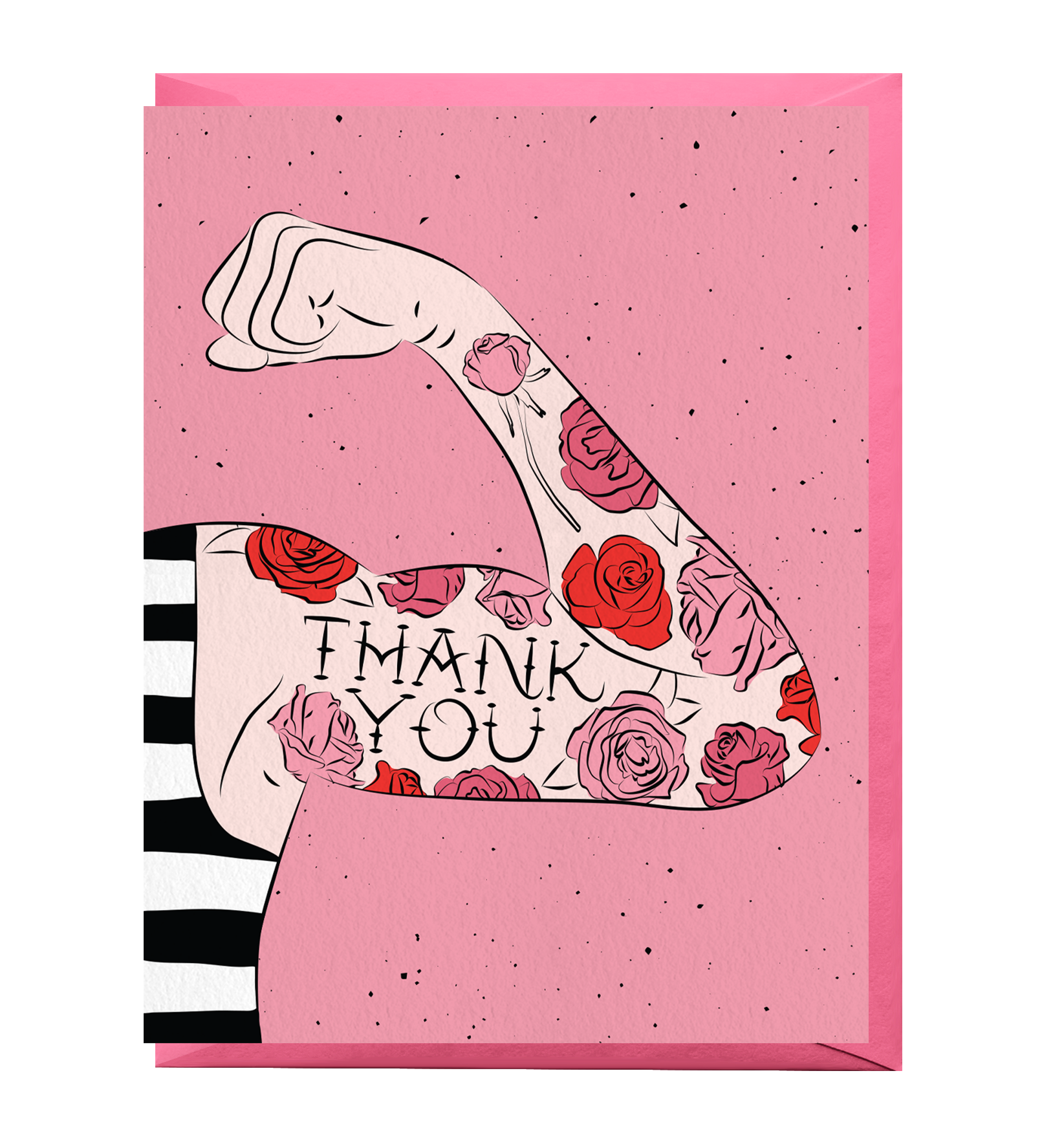 Blank thank you card features an illustrated flexed bicep covered in rose tattoos in red, mauve and pink.